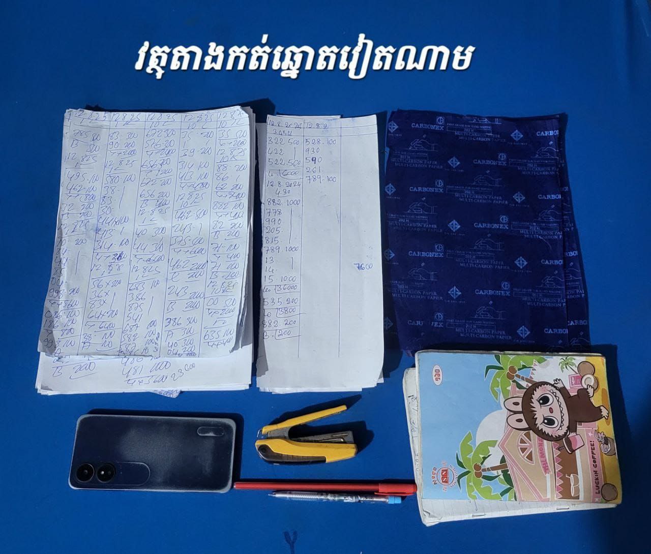 លោកអធិការបានបន្តថា ភ្លាមៗនោះ សមត្ថកិច្ចបានឃាត់ខ្លួនជនសង្ស័យឈ្មោះ ព្រុំ ប៊ុនធឿន (ប្រុស, ៥១ឆ្នាំ) និងដកហូតវត្ថុតាងជាច្រើន រួមមាន៖ ទូរស័ព្ទដៃម៉ាក OPPO ១គ្រឿង, ក្រដាស A4 កត់លេខឆ្នោតរួច ២៥សន្លឹក, ក្រដាស A4 តូចកត់លេខឆ្នោតរួច ៩សន្លឹក, ក្រដាសគូសផ្តាន ២សន្លឹក, ប៉ិច ២ដើម និងសៀវភៅកត់លេខឆ្នោត ១ក្បាល។