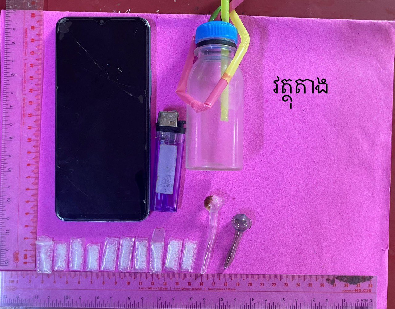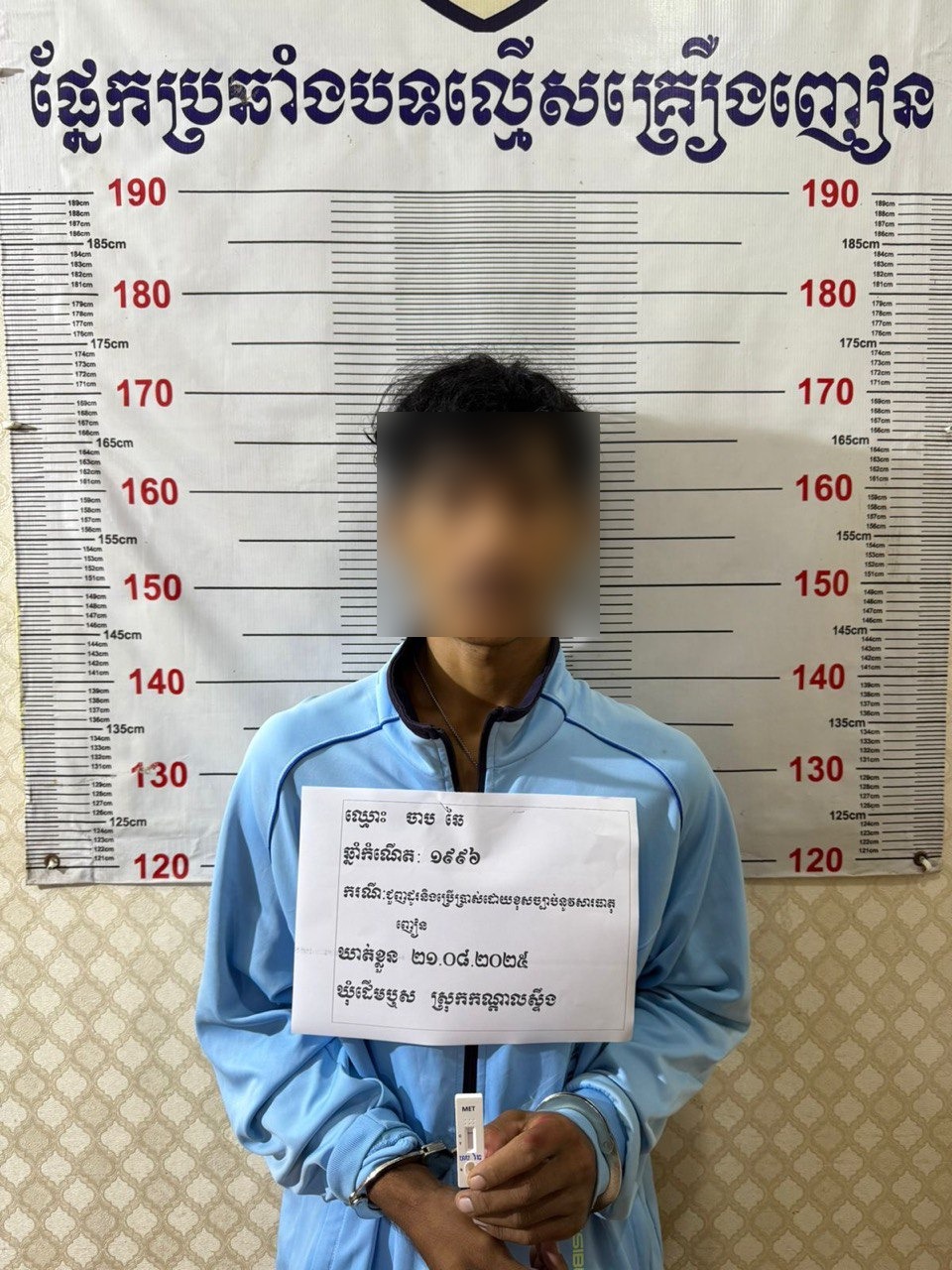 លោកអធិការបានបន្តថា ពេលទៅដល់ កម្លាំងសមត្ថកិច្ចបានឃើញជនសង្ស័យកំពុងអង្គុយនៅលើគ្រែក្រោមសំយាបផ្ទះ។ ភ្លាមៗនោះ សមត្ថកិច្ចបានឃាត់ខ្លួនជនសង្ស័យ និងដកហូតបានវត្ថុតាងនៅនឹងកន្លែងរួមមាន ថ្នាំញៀនចំនួន ១០កញ្ចប់តូច, ទូរស័ព្ទដៃម៉ាក Vivo ១គ្រឿង និងឧបករណ៍ប្រើប្រាស់មួយចំនួន។ តាមការធ្វើតេស្ត ជនសង្ស័យមានលទ្ធផលវិជ្ជមាន(+)សារធាតុញៀន។