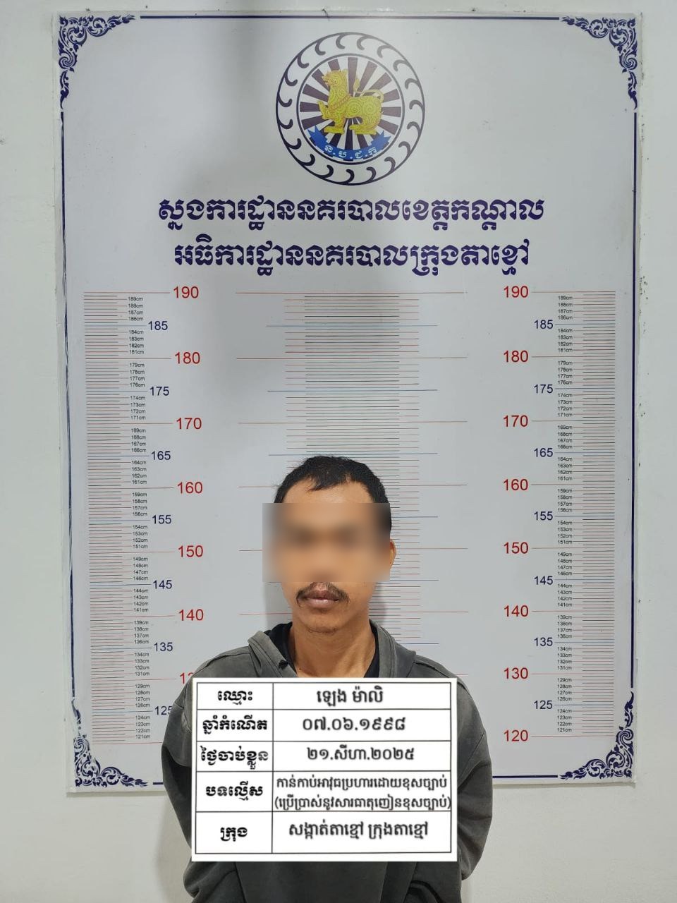 លោកវរសេនីយ៍ឯក យី វណ្ណដា អធិការនគរបាលក្រុងតាខ្មៅបានឲ្យដឹងថា ជនសង្ស័យដែលត្រូវបានឃាត់ខ្លួនមានឈ្មោះ ឡេង ម៉ាលិ (ប្រុស, ២៧ឆ្នាំ) និងឈ្មោះ ណាគ្រី ភារម្យ (ប្រុស, ២០ឆ្នាំ)។ ជនសង្ស័យទាំងពីរនាក់គ្មានមុខរបរពិតប្រាកដ រស់នៅភូមិផ្សាកណ្ដាល សង្កាត់ផ្សារកណ្ដាល ខណ្ឌដូនពេញ រាជធានីភ្នំពេញ ហើយមានលទ្ធផលតេស្តទឹកនោមវិជ្ជមាន(+)សារធាតុញៀន។