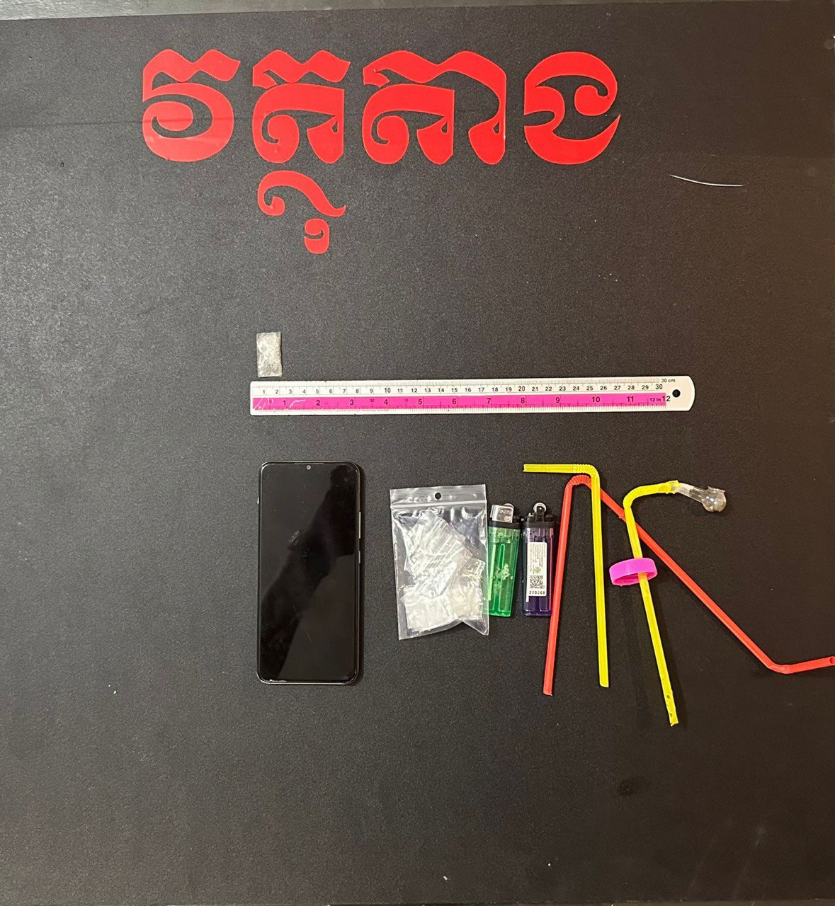 ក្នុងប្រតិបត្តិការនេះ សមត្ថកិច្ចបានដកហូតវត្ថុតាងរួមមាន៖ ម្សៅក្រាមពណ៌សថ្លាសង្ស័យជាសារធាតុញៀន (ម៉ាទឹកកក) ១កញ្ចប់តូច ទម្ងន់ ០,១៦ក្រាម, ទូរសព្ទដៃ ១គ្រឿងម៉ាក Realme ពណ៌ត្រួយចេក និងឧបករណ៍សម្រាប់ប្រើប្រាស់វេចខ្ចប់គ្រឿងញៀនមួយចំនួន។