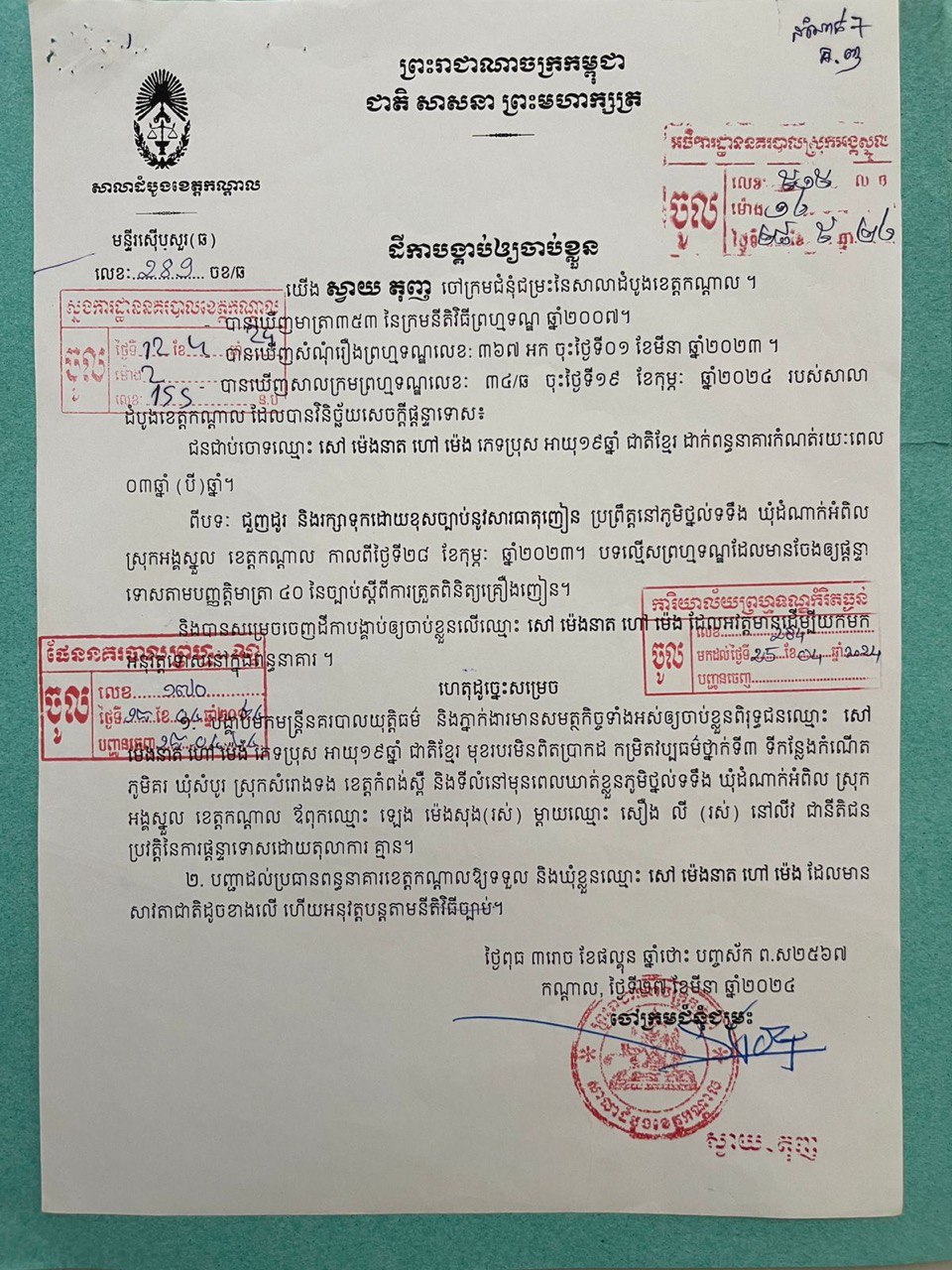 លោកវរសេនីយ៍ឯក មាន សំណាង អធិការនគរបាលស្រុកអង្គស្នួល បានឲ្យដឹងថា ជនសង្ស័យទាំង ២នាក់មានឈ្មោះ សៅ ម៉េងនាត (ហៅម៉េង, វី) (ប្រុស, ២០ឆ្នាំ) និងឈ្មោះ ស៊ីម កានីន (ហៅយួន) (ប្រុស, ៣០ឆ្នាំ)។ ពួកគេទាំងពីរនាក់មានសារធាតុញៀនក្នុងទឹកនោម (+) ហើយឈ្មោះ សៅ ម៉េងនាត ក៏មានដីកាបង្គាប់ឲ្យចាប់ខ្លួនពីបទជួញដូរ និងរក្សាទុកគ្រឿងញៀនកាលពីថ្ងៃទី២៨ កុម្ភៈ ២០២៣ ផងដែរ។