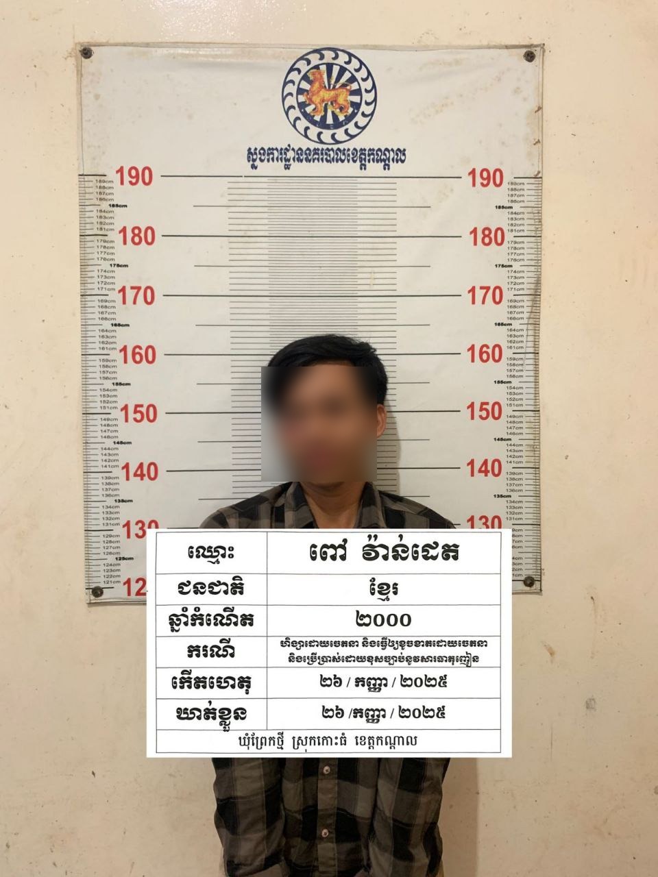 យុវជនម្នាក់ដែលធ្លាប់ជាប់ពន្ធនាគារ ៣ឆ្នាំ ពីបទបង្កហិង្សា និងប្រើប្រាស់គ្រឿងញៀន ពេលចេញមកវិញបានប្រើប្រាស់គ្រឿងញៀនហួសកម្រិតបណ្ដាលឲ្យបែកអារម្មណ៍ រួចយកពូថៅដៃទៅដេញកាប់អ្នកភូមិ និងកាប់បំផ្លាញម៉ូតូរបស់ជនរងគ្រោះ។ ជនសង្ស័យរូបនេះត្រូវបានសមត្ថកិច្ចនគរបាលស្រុកកោះធំឃាត់ខ្លួនបាន កាលពីព្រឹកថ្ងៃទី២៦ កញ្ញា ២០២៥ នៅលើផ្លូវបេតុងក្នុងភូមិព្រែកថ្មី ឃុំព្រែកថ្មី ស្រុកកោះធំ ខេត្តកណ្ដាល។