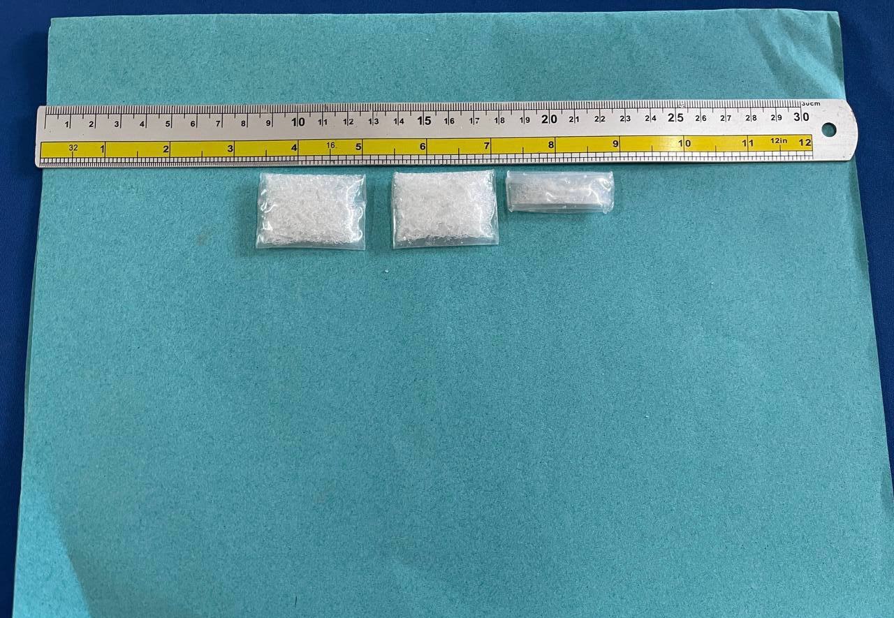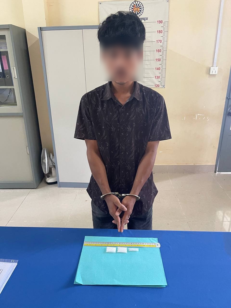 លោកអធិការបានបន្តថា វត្ថុតាងដែលដកហូតបានមាន៖ ម្សៅក្រាមសថ្លាសង្ស័យជាសារធាតុញៀន (ម៉ាទឹកកក) ចំនួន ៣កញ្ចប់ (តូច ១, មធ្យម ២) ទម្ងន់ ៤,៥៤ក្រាម និងម៉ូតូគុបជ្រុងគ្មានស្លាកលេខ ១គ្រឿង។
