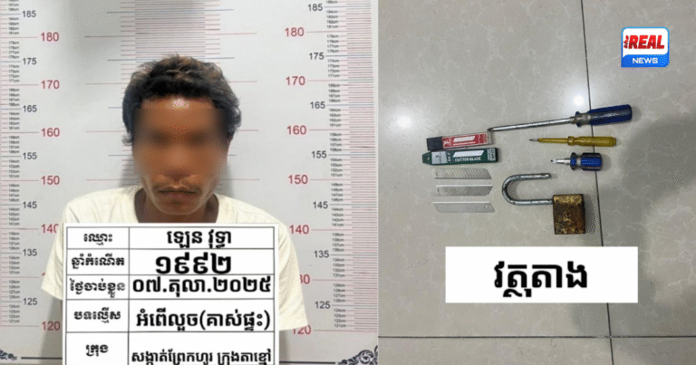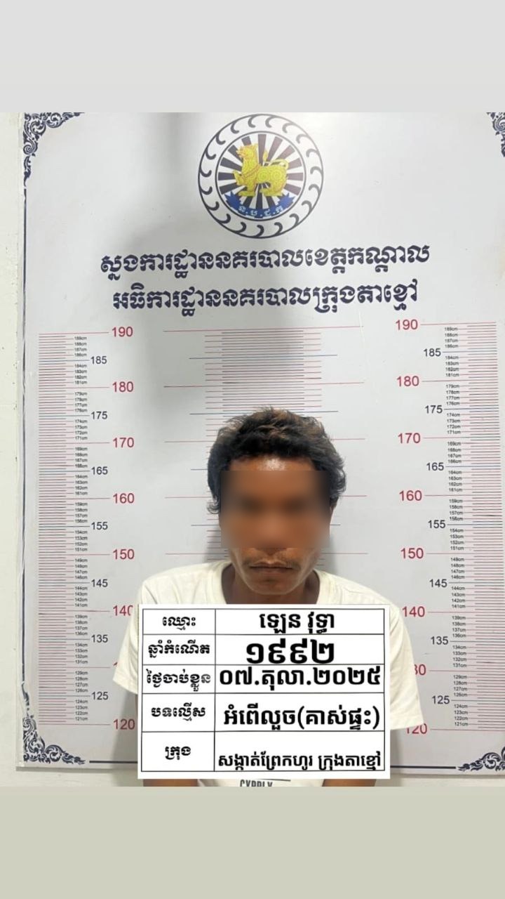 បុរសម្នាក់បានធ្វើសកម្មភាពគាស់ផ្ទះលួចទ្រព្យសម្បត្តិ ខណៈម្ចាស់មិននៅ តែភ្លេចគិតថាដល់ម៉ោងម្ចាស់ផ្ទះត្រឡប់មកវិញ។ ជនសង្ស័យរូបនេះត្រូវបានម្ចាស់ផ្ទះឃើញទាន់ ហើយបានទូរសព្ទប្ដឹងសមត្ថកិច្ចឲ្យចុះមកឃាត់ខ្លួននៅក្នុងផ្ទះតែម្ដង កាលពីព្រឹកថ្ងៃទី៧ តុលា ២០២៥។ ហេតុការណ៍នេះបានកើតឡើងនៅភូមិព្រែកហូរកើត១ សង្កាត់ព្រែកហូរ ក្រុងតាខ្មៅ ខេត្តកណ្ដាល។
