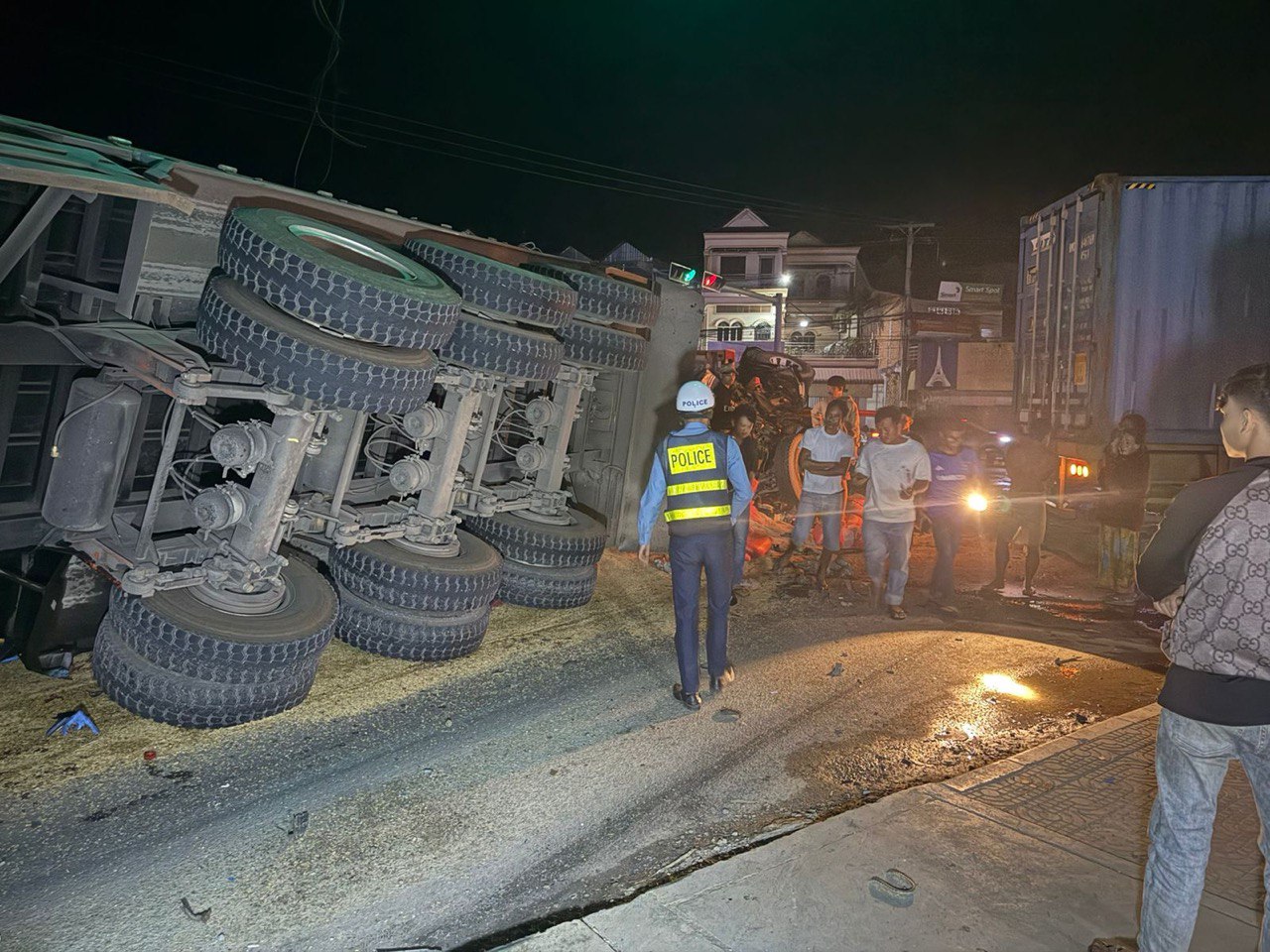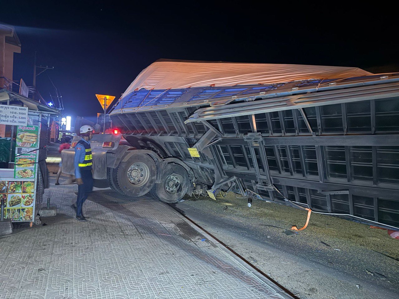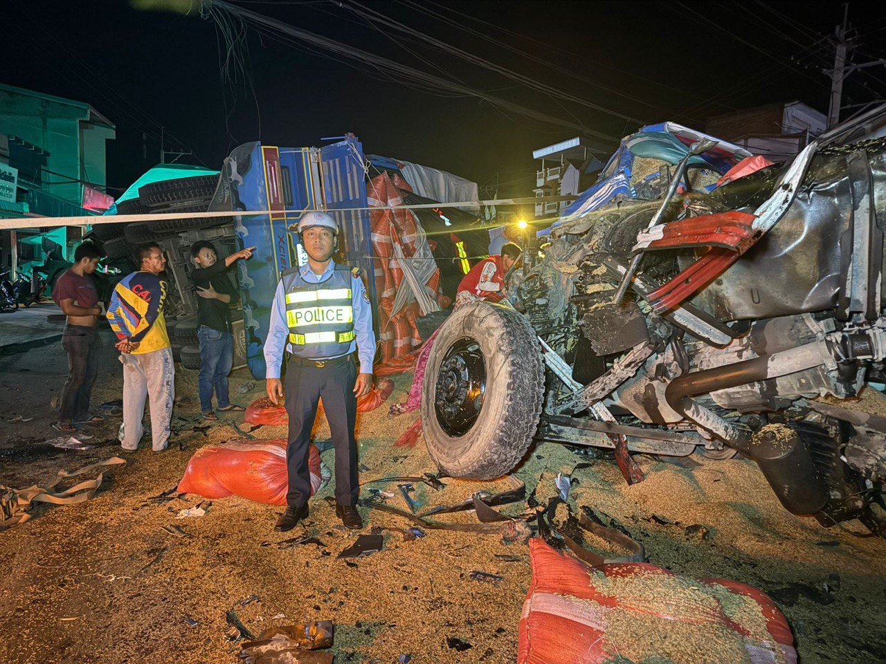 លោកវរសេនីយ៍ឯក មាន សំណាង អធិការនគរបាលស្រុកអង្គស្នួល បានឲ្យដឹងថា គ្រោះថ្នាក់នេះកើតឡើងរវាងរថយន្តម៉ាក MITSUBISHI FUSO (ប្រភេទសណ្ដោងរ៉ឺម៉កដឹងទូរកុងទីន័រ) ពណ៌ខៀវ ពាក់ផ្លាកលេខ ភ្នំពេញ 3E-6228 សឺមីរ៉ឺម៉ក ពាក់ផ្លាកលេខ ភ្នំពេញ 4A-9241 និងរថយន្តម៉ាក HYUNDAI (ប្រភេទសណ្ដោងរ៉ឺម៉កដឹកទំនិញធន់ធំ) ពណ៌ទឹកប្រាក់ ពាក់ផ្លាកលេខ ឧ.មានជ័យ 3A-3689 សឺមីរ៉ឺម៉ក ពាក់ផ្លាកលេខ កំពង់ចាម 4A-3100។
