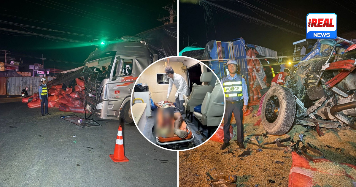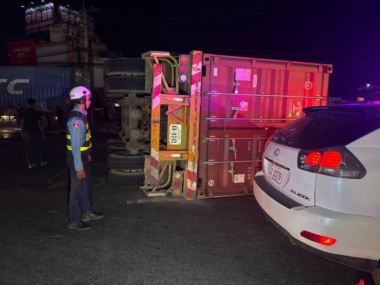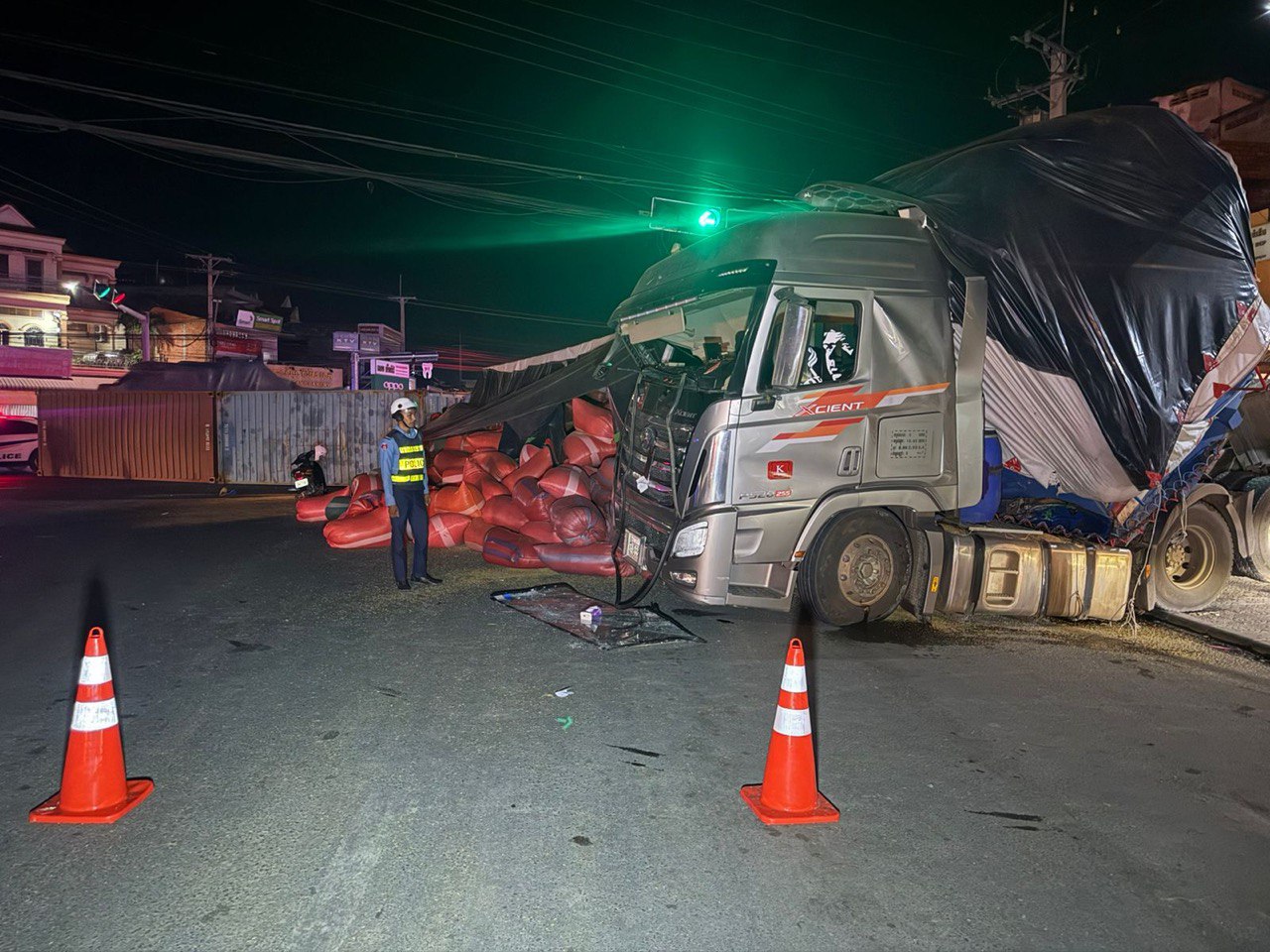 លោកវរសេនីយ៍ឯក មាន សំណាង អធិការនគរបាលស្រុកអង្គស្នួល បានឲ្យដឹងថា គ្រោះថ្នាក់នេះកើតឡើងរវាងរថយន្តម៉ាក MITSUBISHI FUSO (ប្រភេទសណ្ដោងរ៉ឺម៉កដឹងទូរកុងទីន័រ) ពណ៌ខៀវ ពាក់ផ្លាកលេខ ភ្នំពេញ 3E-6228 សឺមីរ៉ឺម៉ក ពាក់ផ្លាកលេខ ភ្នំពេញ 4A-9241 និងរថយន្តម៉ាក HYUNDAI (ប្រភេទសណ្ដោងរ៉ឺម៉កដឹកទំនិញធន់ធំ) ពណ៌ទឹកប្រាក់ ពាក់ផ្លាកលេខ ឧ.មានជ័យ 3A-3689 សឺមីរ៉ឺម៉ក ពាក់ផ្លាកលេខ កំពង់ចាម 4A-3100។