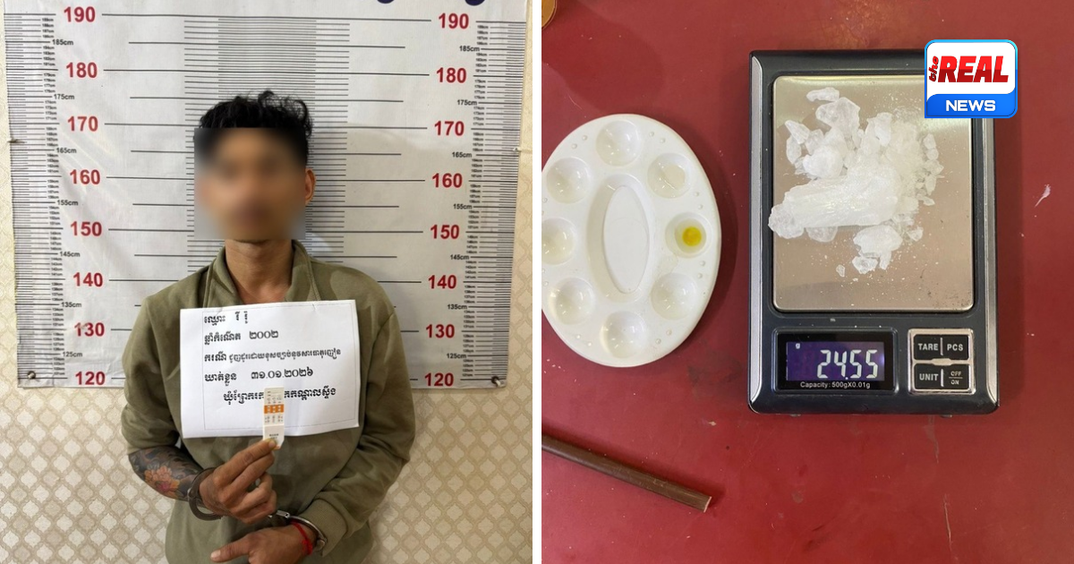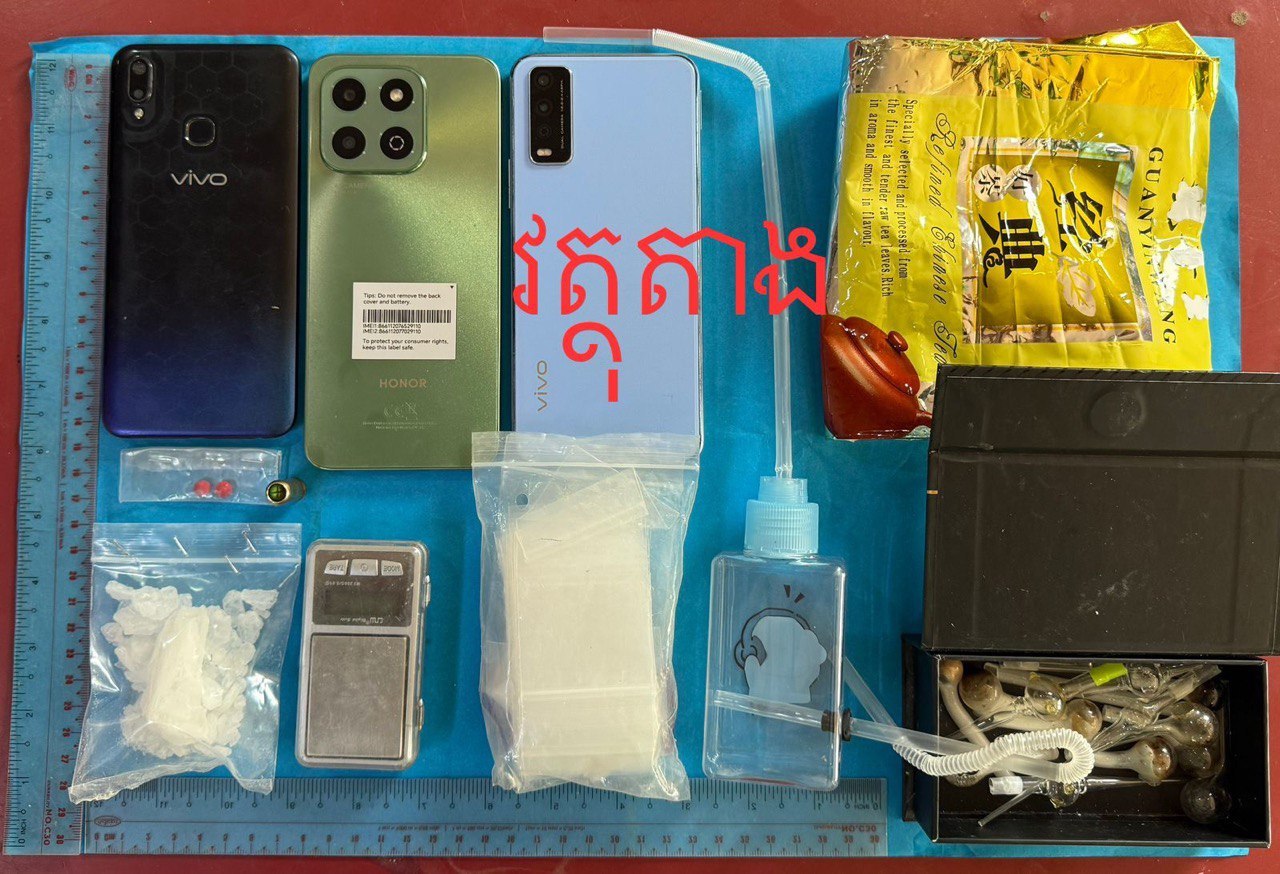 ប្រភពពីសមត្ថកិច្ចបានឲ្យដឹងថា ជនសង្ស័យឈ្មោះ រី រ៉ូ (ប្រុស, ២៤ឆ្នាំ) រស់នៅភូមិកោះគរ ឃុំរកាខ្ពស់ ក្រុងតាខ្មៅ ខេត្តកណ្ដាល មុខរបរមិនពិតប្រាកដ (មានសារធាតុញៀនក្នុងទឹកនោម)។ វត្ថុតាងដែលដកហូតបានរួមមាន ម្សៅក្រាមសថ្លា ១កញ្ចប់ធំ (ទម្ងន់ ២៤,៥៥ក្រាម), ថ្នាំញៀនប្រភេទ WY ២គ្រាប់ (ពណ៌ផ្កាឈូក), ជញ្ជីងថ្លឹងគ្រឿងញៀន ១គ្រឿង, ទូរស័ព្ទដៃ ៣គ្រឿង សំបកឡតគ្រាប់កាំភ្លើងខ្លី ១គ្រាប់ និងសម្ភារវេចខ្ចប់មួយចំនួន។