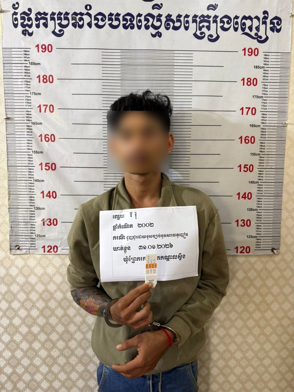 ប្រភពដដែលបានបន្តថា ដើមឡើយនៅថ្ងៃទី៣០ មករា ២០២៦ វេលាម៉ោង ២១និង១០នាទី កម្លាំងប៉ុស្តិ៍នគរបាលរដ្ឋបាលព្រែករកា សហការជាមួយកម្លាំងជំនាញ បានឃាត់ខ្លួនជនសង្ស័យខាងលើនៅផ្ទះរបស់គេ ដោយសង្ស័យពាក់ព័ន្ធករណីទទួលផលចោរកម្ម (ទិញម៉ូតូ CRF ពីឈ្មោះ ទីណូ)។ លុះដល់ព្រឹកថ្ងៃទី៣១ មករា ២០២៦ វេលាម៉ោង ៩និង៣០នាទី សមត្ថកិច្ចបានសុំគោលការណ៍ពីតំណាងអយ្យការដើម្បីឆែកឆេរផ្ទះជនសង្ស័យស្វែងរកវត្ថុតាងបន្ថែម ក៏ប្រទះឃើញថ្នាំញៀនលាក់ទុកលើទូឈើដាក់ខោអាវតែម្ដង។