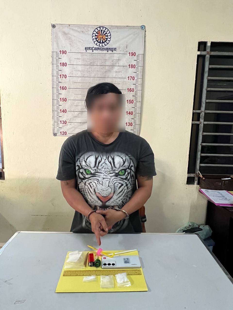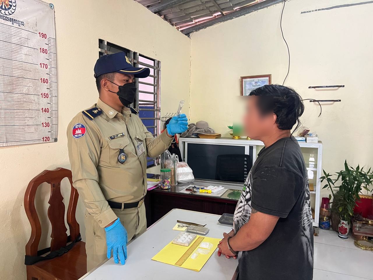 លោកវរសេនីយ៍ឯក ព្រុំ សំណាង អធិការនគរបាលស្រុកកៀនស្វាយ បានឲ្យដឹងថា ជនសង្ស័យទាំង ៣នាក់រួមមាន ទី១ឈ្មោះ អ៊ិន ថាន់ (ប្រុស, ៤៣ឆ្នាំ) មុខរបរមិនពិតប្រាកដ មានទីលំនៅភូមិកោះប្រាក់ ឃុំភូមិធំ (ជាអ្នកត្រូវឃាត់ខ្លួន) ទី២ឈ្មោះ ឈុន សុខាលុច្ស (ប្រុស, ២៩ឆ្នាំ) មានទីលំនៅភូមិភូមិធំ (រត់គេចខ្លួន) និងទី៣ឈ្មោះ នួន ចាន់ធី (ប្រុស, ៣៣ឆ្នាំ) មានទីលំនៅភូមិភូមិធំ (ជាមេក្លោងកំពុងរត់គេចខ្លួន)។ លោកអធិការបានបន្តថា វត្ថុតាងដែលកម្លាំងសមត្ថកិច្ចដកហូតបានពីជនសង្ស័យឈ្មោះ អ៊ិន ថាន់ រួមមានម្សៅក្រាមពណ៌សថ្លាសង្ស័យជាសារធាតុញៀន (ម៉ាទឹកកក) ចំនួន ៣កញ្ចប់ (ធំ១ និងមធ្យម២ ទម្ងន់ ១៥,៨៥ក្រាម), ទូរស័ព្ទដៃ ១គ្រឿង ម៉ាក Realme ពណ៌ស ព្រមទាំងសម្ភារៈប្រើប្រាស់ និងវេចខ្ចប់គ្រឿងញៀនមួយចំនួនទៀត។